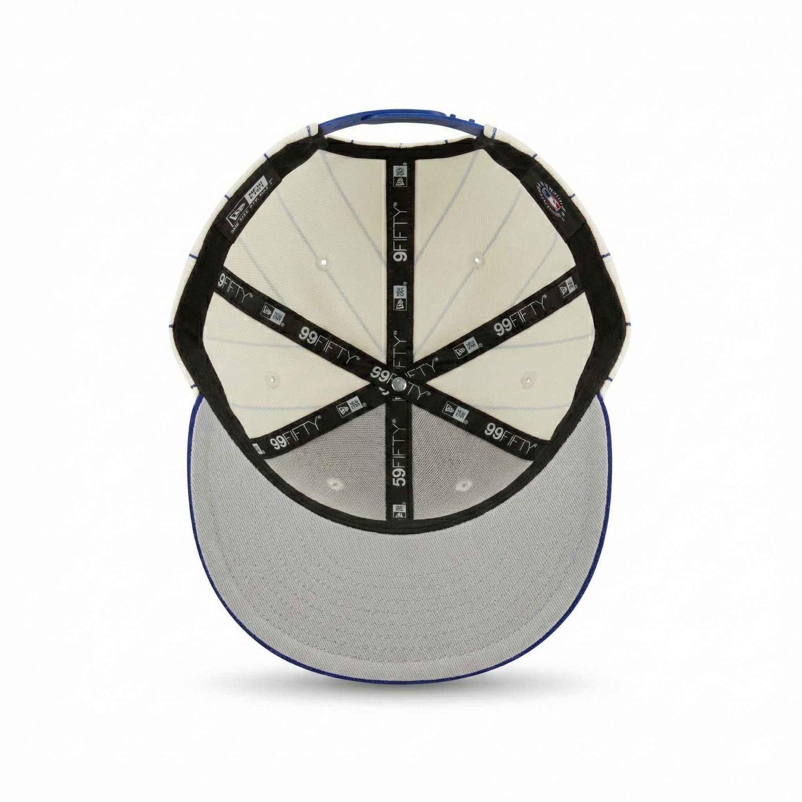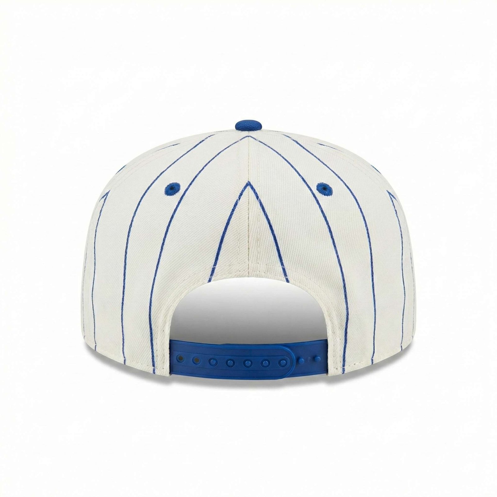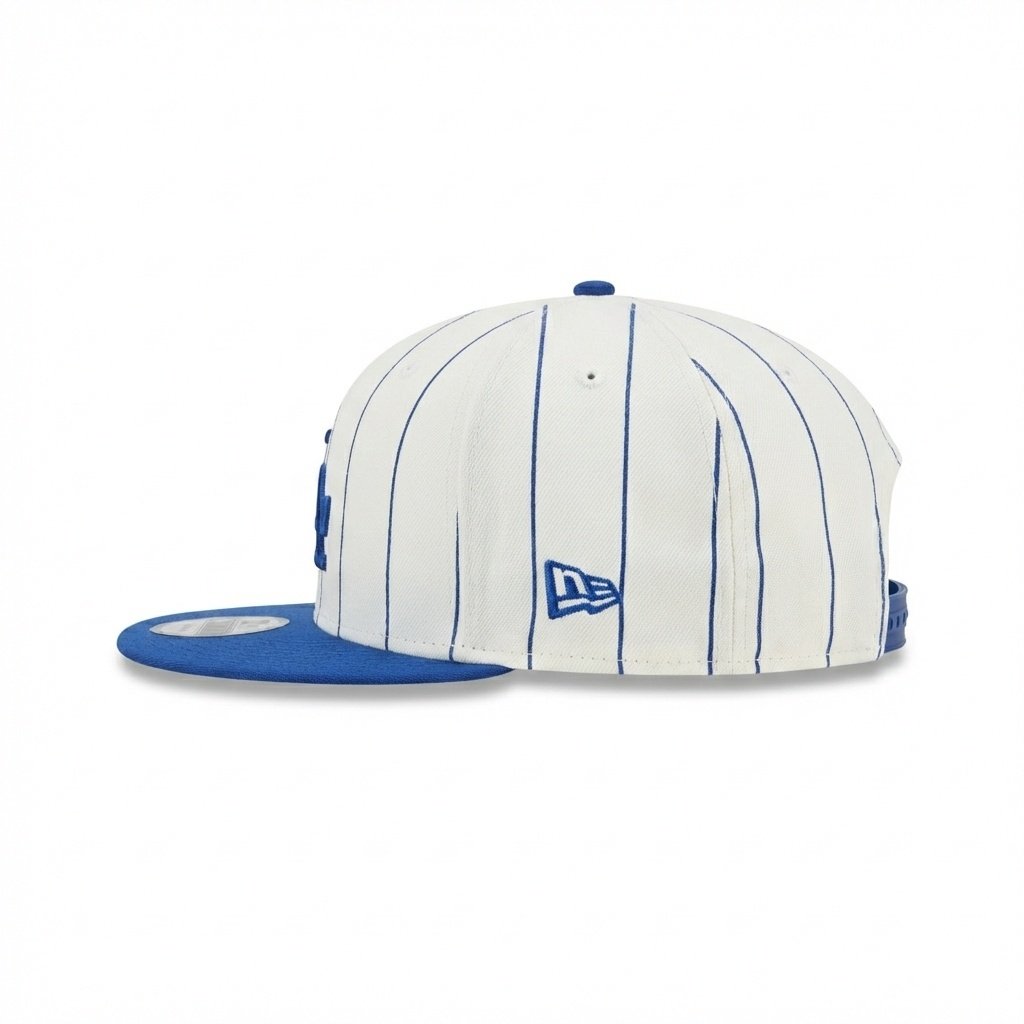 Diseño Pinstripe (Rayas): La corona en color blanco presenta delgadas líneas verticales en azul rey, replicando fielmente la textura y estética de las camisolas de béisbol retro.