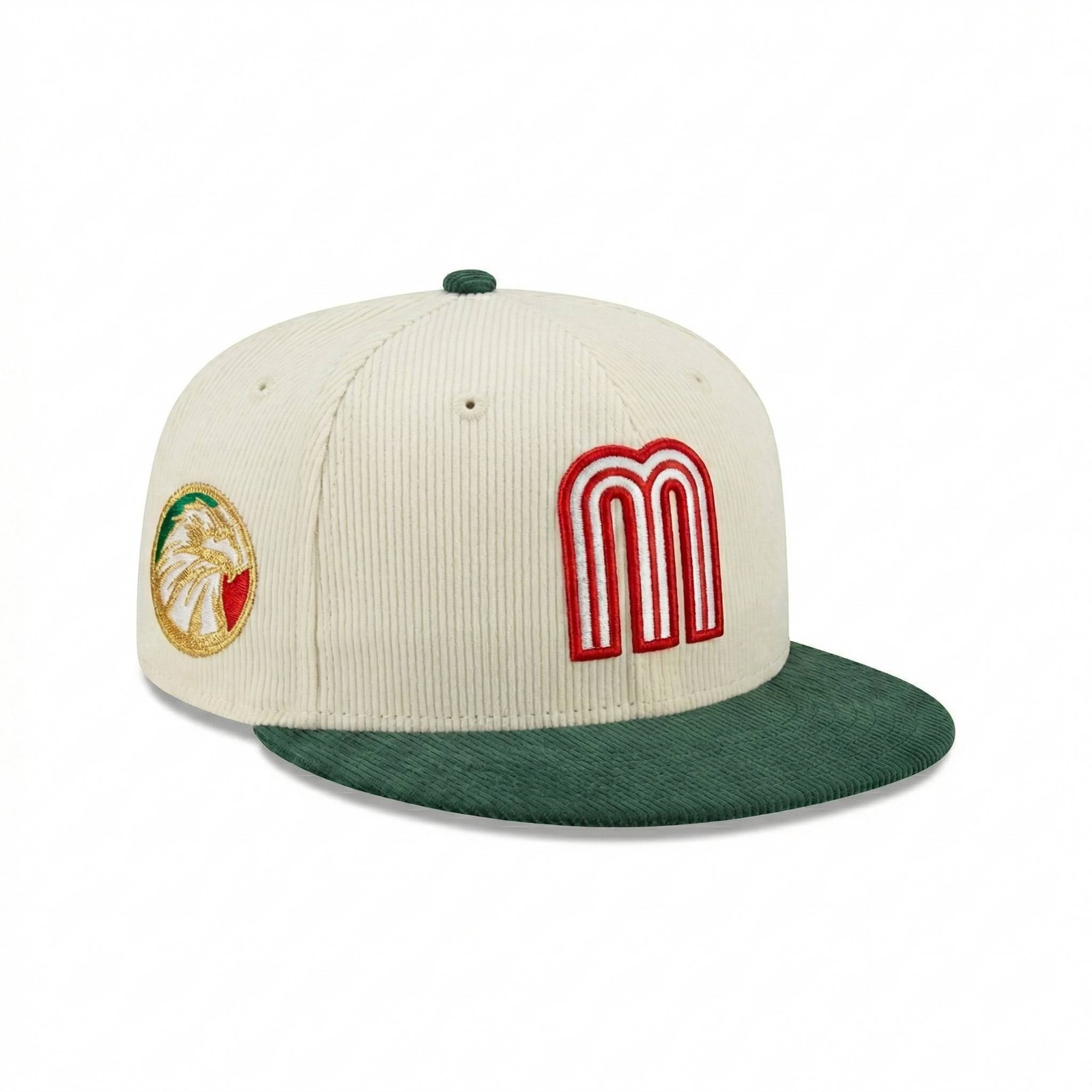 • Logotipo “M” Estilizado: Al frente luce la emblemática “M” de México bordada en relieve con una combinación de rojo y blanco, destacando con fuerza sobre la textura de la pana.